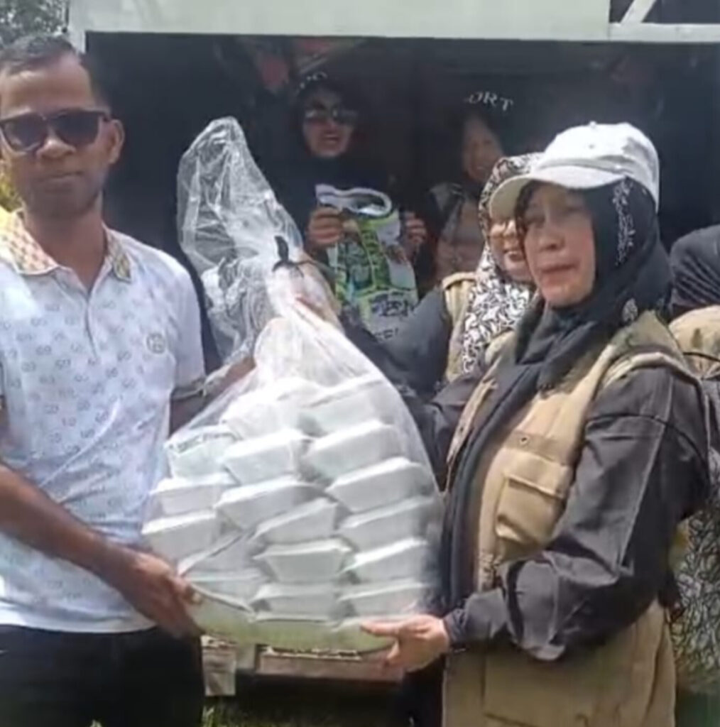 Ketua ASKI Lhokseumawe, Hasrida saat menyerahkan bantuan kepada masyarakat (Foto, Minggu, (18/1/2026)