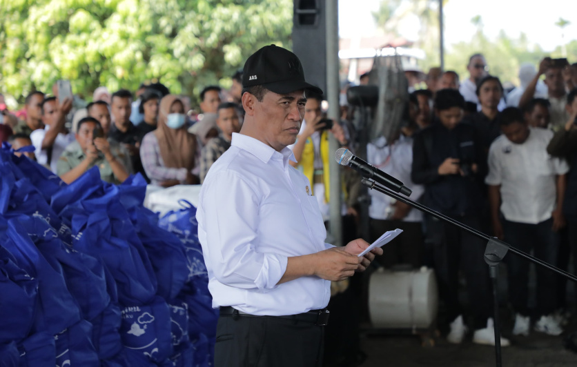 Menteri Pertanian RI Andi Amran Sulaiman di groundbreaking rehabilitasi lahan sawah terdampak bencana sekaligus penyerahan bantuan Kementerian Pertanian–Bapanas Peduli Provinsi Aceh Tahun 2026.