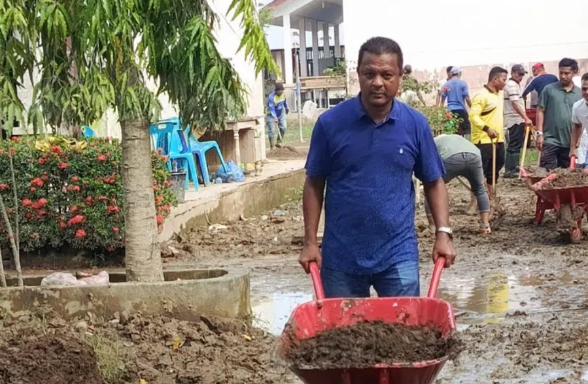 Kepala Dinas PUPR Lhokseumawe, Said Bachtiar, memimpin gotong royong pascabencana yang berlangsung di Kecamatan Muara Batu, Aceh Utara, pada Sabtu (3/1)....