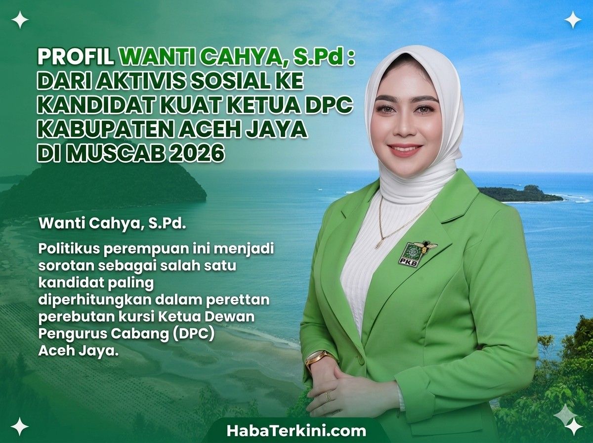 Habaterkini.com – Aceh Jaya, Dinamika Musyawarah Cabang (Muscab) Partai Kebangkitan Bangsa (PKB) Aceh Jaya tahun 2026 menghadirkan satu nama yang kian menguat, Wanti Cahya, S.Pd. Politikus perempuan ini menjadi sorotan sebagai salah satu kandidat paling diperhitungkan dalam perebutan kursi Ketua Dewan Pengurus Cabang (DPC) PKB Aceh Jaya.