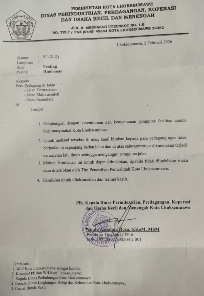 Surat bernomor 511.2/91 tertanggal 2 Februari 2026 tersebut ditandatangani Pelaksana Harian Kepala Disperindagkop dan UKM Lhokseumawe, Winda Azminda Roza, S.Kom., MSM. Dalam surat itu, para PKL yang beraktivitas di sepanjang Jalan Darussalam, Jalan Malikussaleh, dan Jalan Samudera diminta menghentikan kegiatan usaha di badan jalan, trotoar, serta di atas saluran drainase.